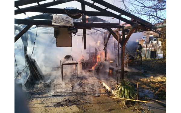 Egy nyaraló udvarában elhelyezett, faszerkezetű autóbeállóval egybeépített húsfüstölő égett hétfő délben, Dombóvár-Gunarason.